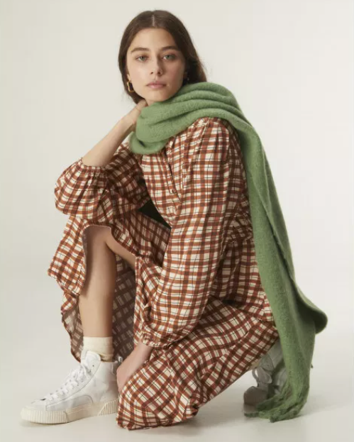 Midi shirt dress with gingham print. Shirt collar and long sleeves. Front buttons and belt.