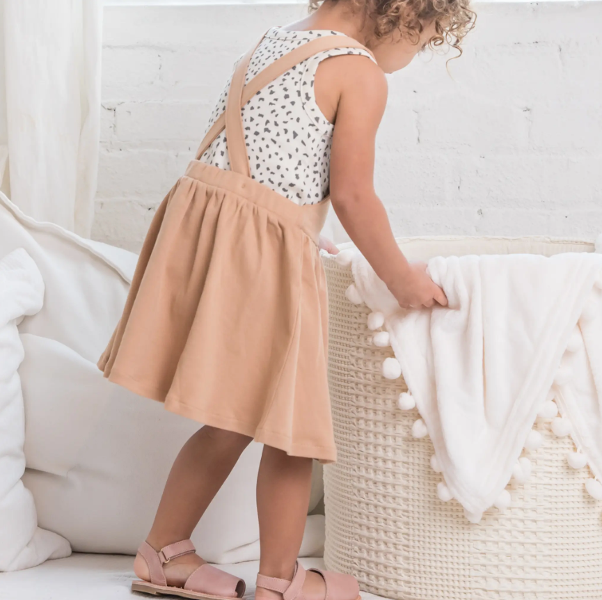 The Jolie Jumper is perfect for layering with one of our long sleeve tops and dressing up any outfit. With super soft fabric and an elastic waistband, your little can still run and play while looking adorable. This dress also features adjustable straps that can be buttoned to create a criss-cross or straight style.