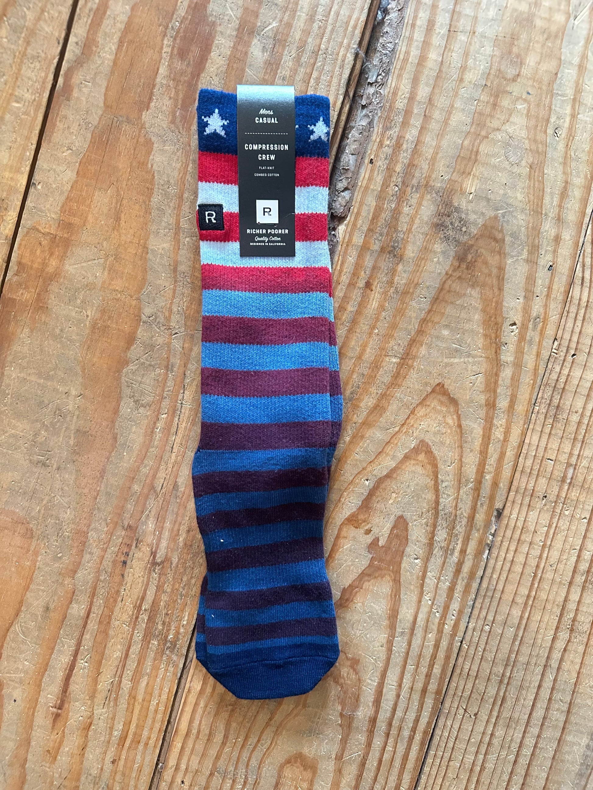Men's compression crew socks. Flat knit combed cotton. American flag design.