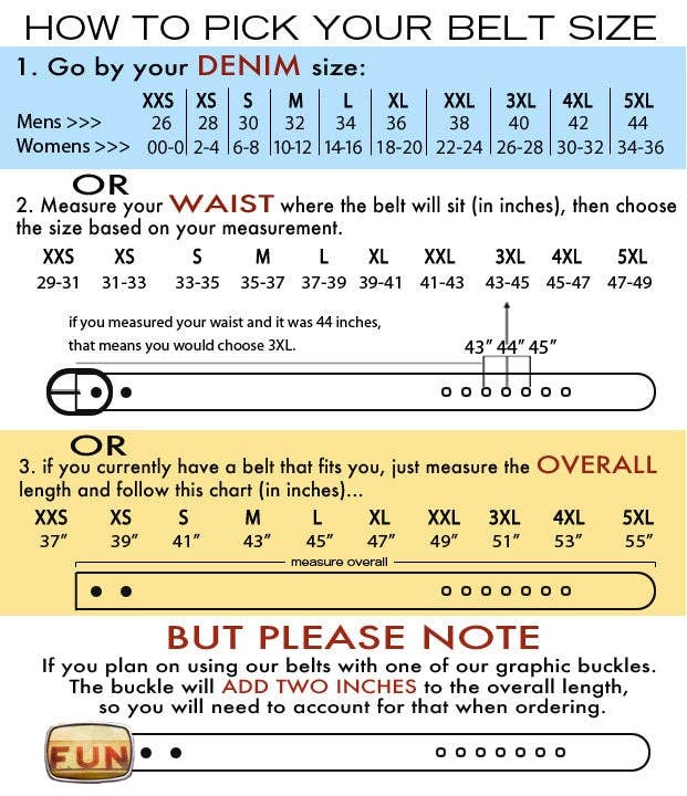 Sizing: Please see our size chart in the images of this listing. This belt is 1.5" wide to fit standard belt loops.