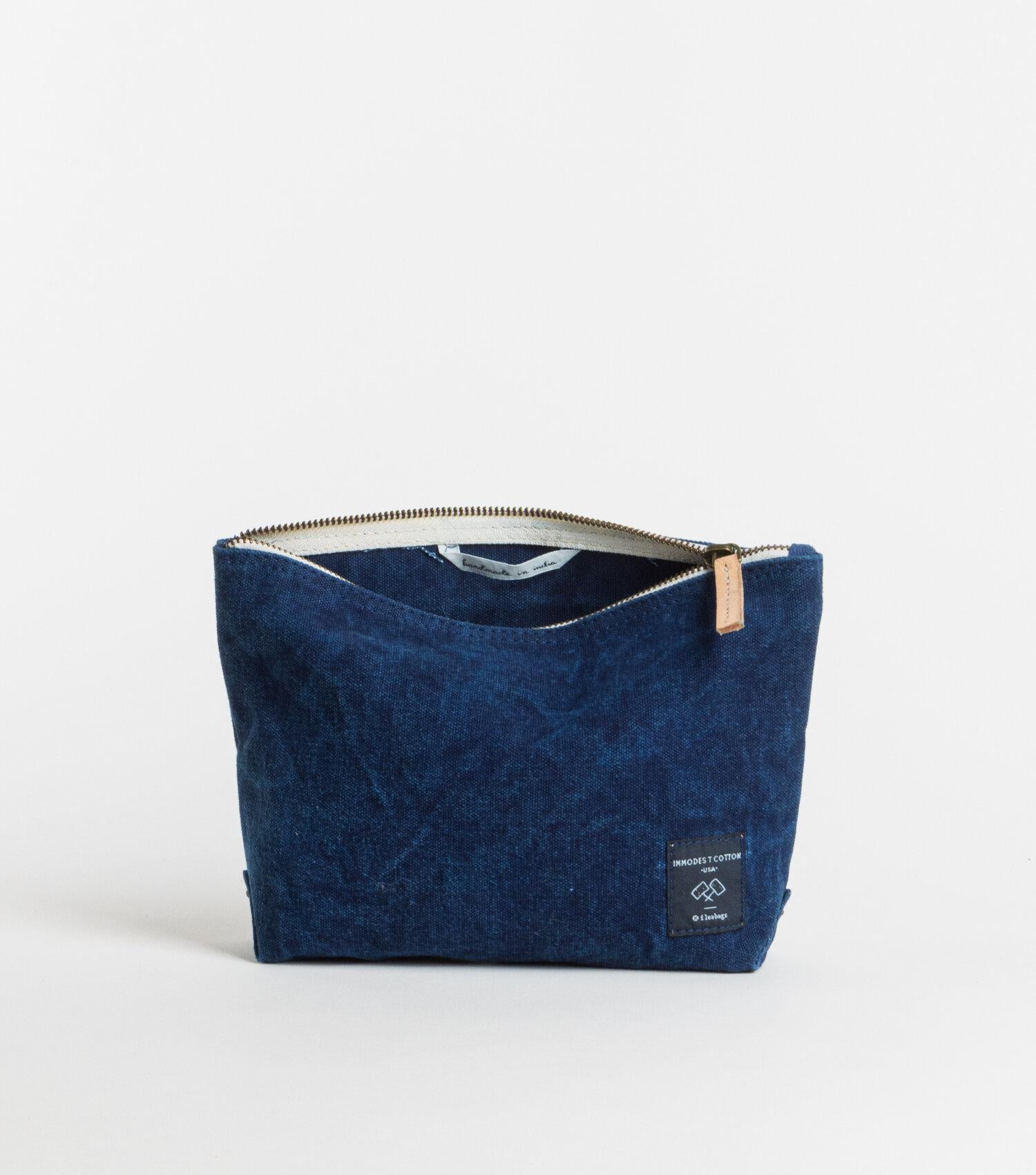 The pouch is 6"H x 9.5"W x 2.5"D, made of 18oz. dyed indigo denim cotton canvas with a veg-tanned leather zipper pull.