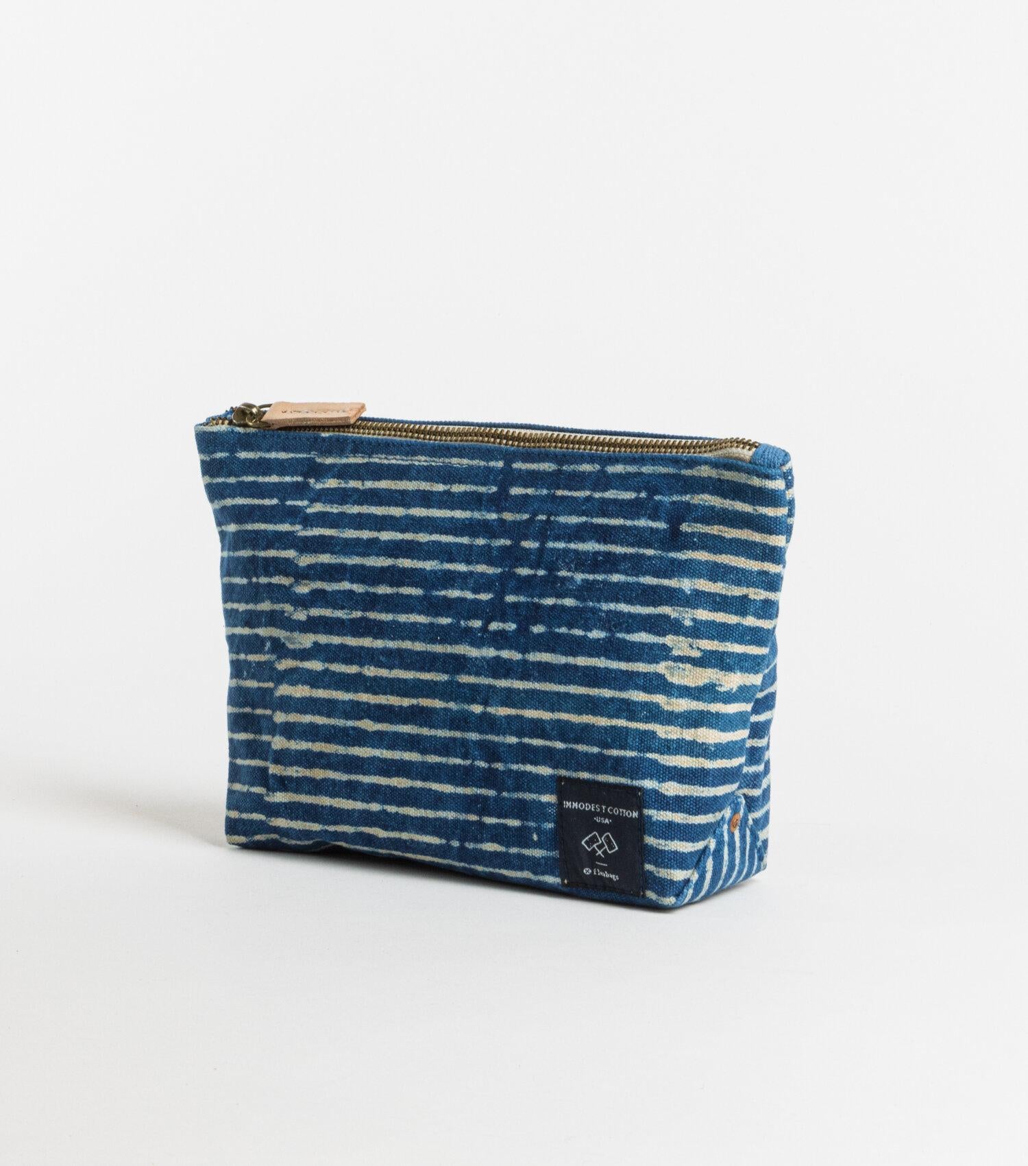 The Sardine Pouch in dark indigo is perfect for toting around toiletries or school supplies. It's inspired by a classic pair of vintage jeans, featuring off-white stitching. The denim cotton canvas has been hand-dipped up to 20 times into a natural indigo vat to achieve the perfect hue. With wear, the fabric will reveal its texture like a favorite pair of jeans.