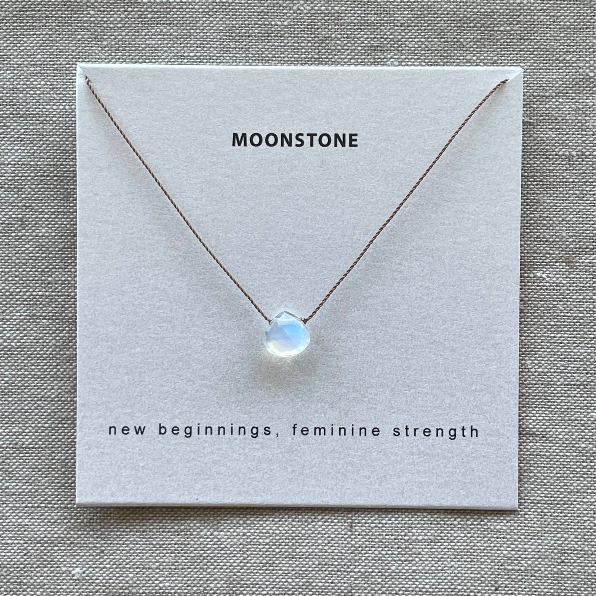 New beginnings necklace featuring a small, non-faceted rainbow moonstone gemstone hand knotted on a thin, durable nylon cord. Finished with a sterling silver spring ring clasp and made to 17". Necklace comes on a pretty card with stone meaning. Makes a lovely gift!