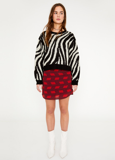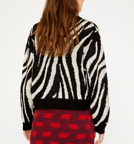 Loose-fit intarsia knit jumper with black zebra print. Round neck and long sleeves. Ribbed detail.